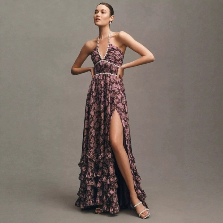 Elevate your wardrobe with the Blossom Ruffle Halter Maxi Dress, a stunning blend of dreamy florals and flowing femininity. Designed with a plunging halter neckline and an elegant open back, this floor-length dress features cascading ruffle layers and a high slit to add just the right touch of allure. Made from lightweight polyester, it’s perfect for weddings, garden soirées, and romantic evenings.