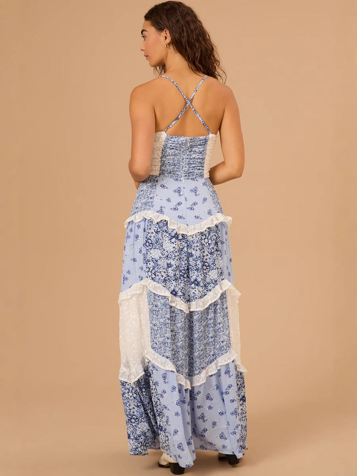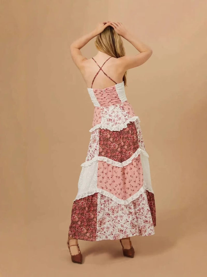 The Boho Patchwork Cotton Maxi Dress brings together rustic charm and feminine flair in a relaxed, breezy silhouette. Crafted from soft, breathable cotton, this dress features a unique patchwork design combining floral prints, lace trim, and delicate ruffle layers. A ruched bodice with adjustable spaghetti straps offers a flattering, comfortable fit, making it perfect for sunny outings, festivals, or countryside getaways.