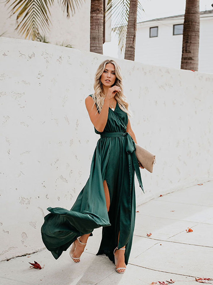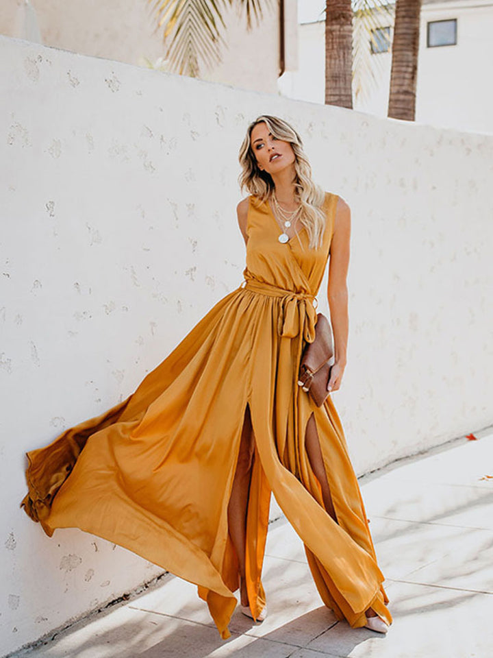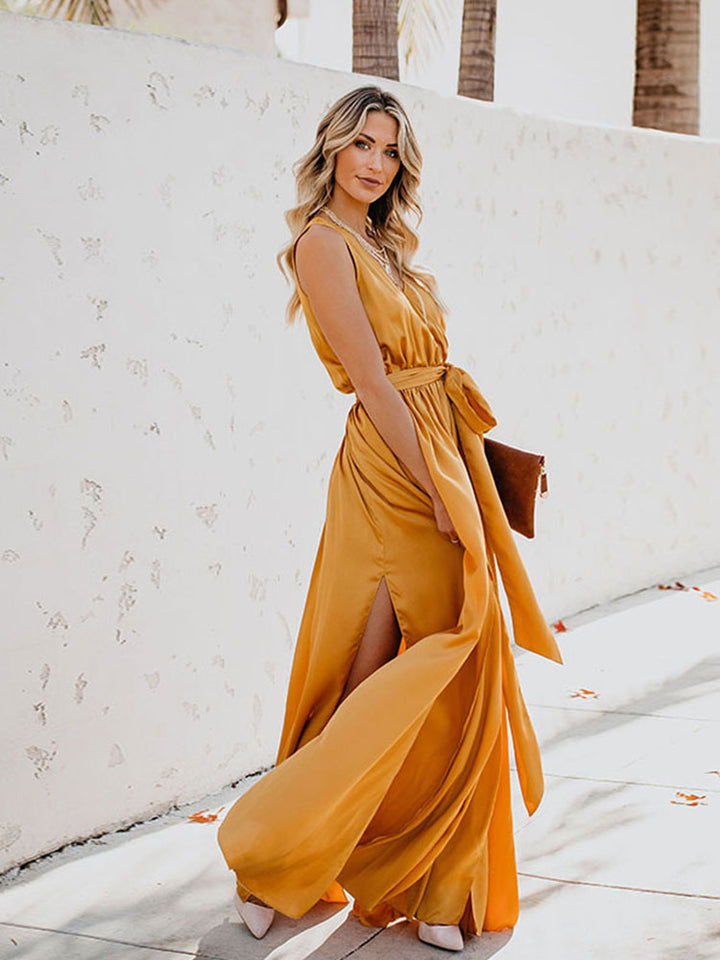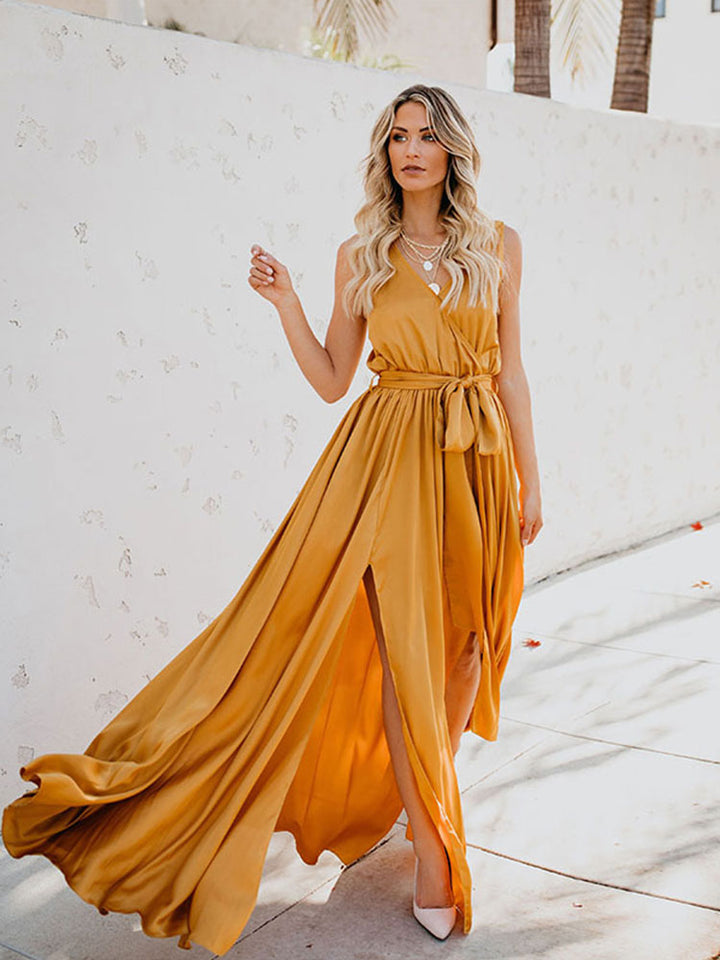 Elevate your wardrobe with this elegant sleeveless V-neck maxi dress featuring a flattering waist tie and dramatic side slit. Designed in vibrant green, yellow, and pink, this long flowy dress is perfect for evening parties, beach weddings, or any special occasion. The soft polyester fabric ensures comfort and a graceful drape that moves with you.