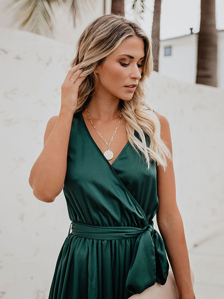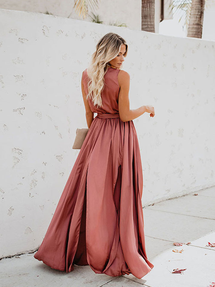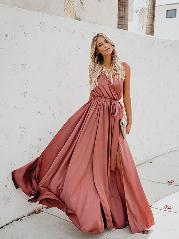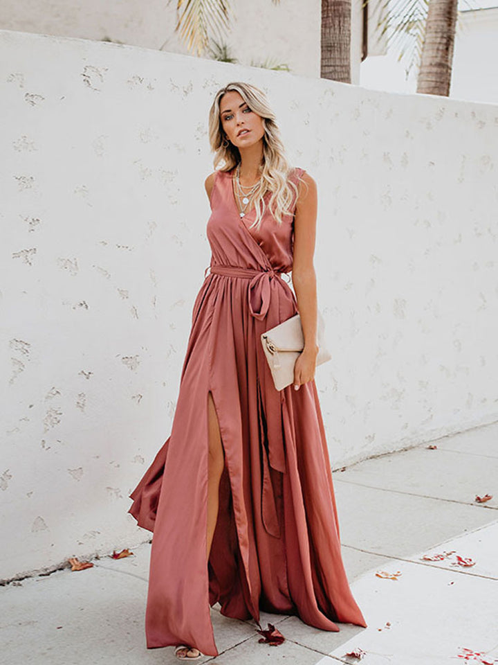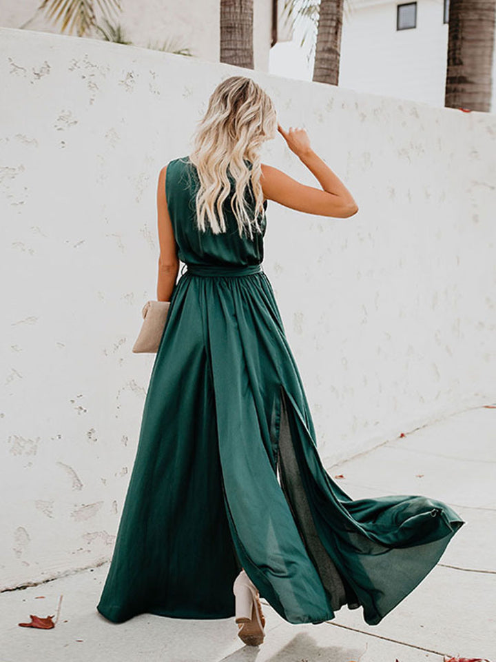 Elevate your wardrobe with this elegant sleeveless V-neck maxi dress featuring a flattering waist tie and dramatic side slit. Designed in vibrant green, yellow, and pink, this long flowy dress is perfect for evening parties, beach weddings, or any special occasion. The soft polyester fabric ensures comfort and a graceful drape that moves with you.