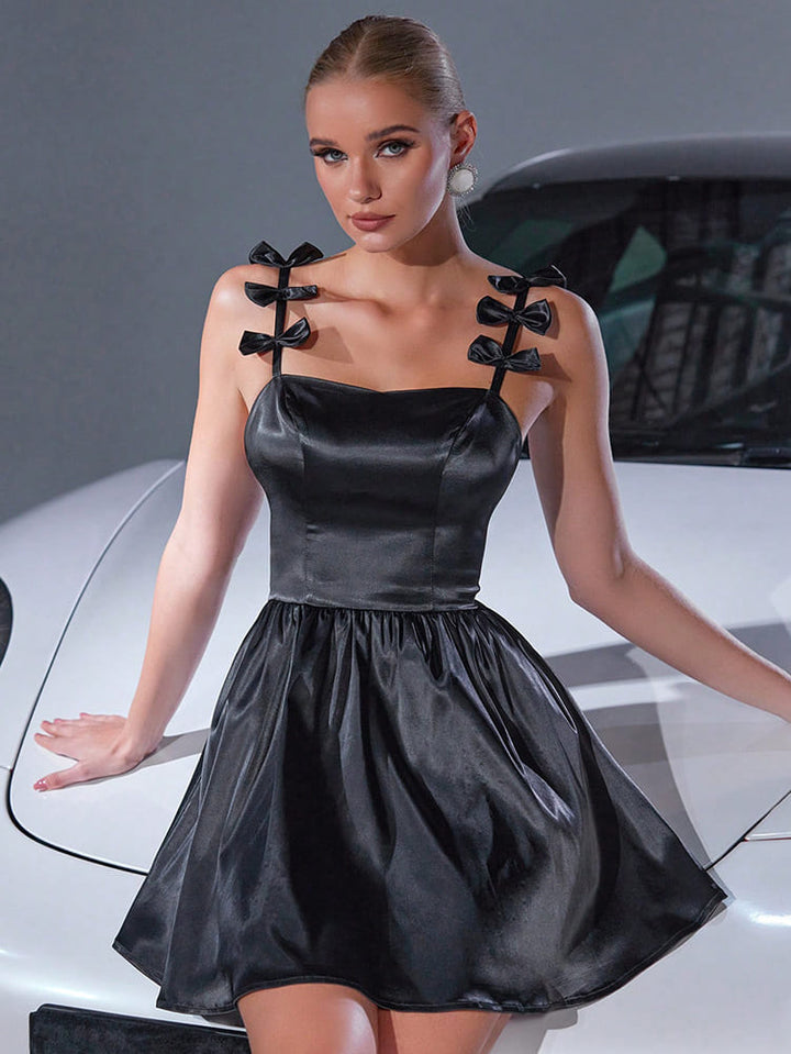 Get your Elegant Black Satin Mini Dress with Bow Straps today at Lazaha and make every occasion unforgettable.