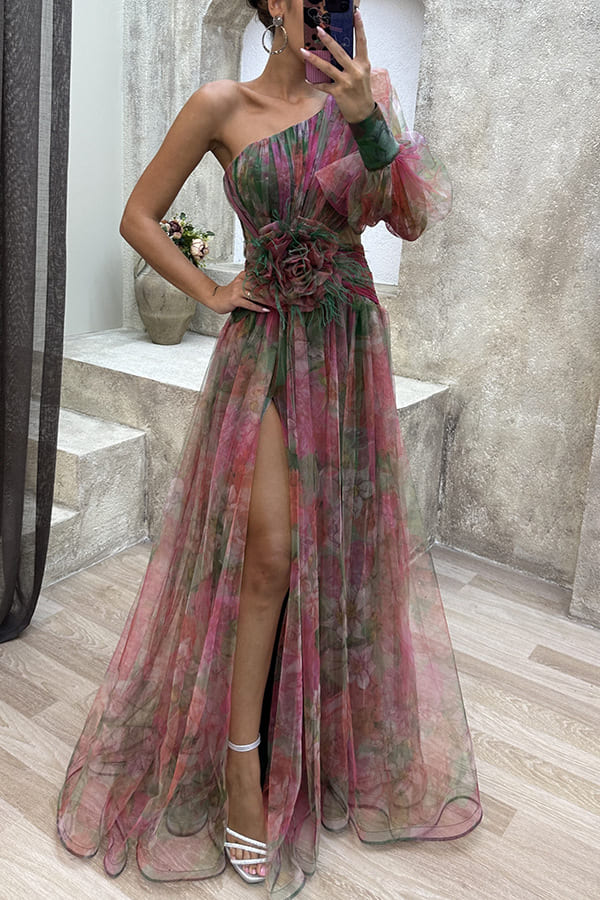 Make a breathtaking entrance with this Elegant One-Shoulder Floral Tulle Gown, designed to impress at any special occasion. With a unique asymmetrical neckline, bold floral accents, and a flowing sheer overlay, this dress brings fairytale elegance to real life. Available in five dreamy shades—Purple, Red, Green, Yellow, and Orange—this gown offers the perfect combination of romance, sophistication, and individuality.