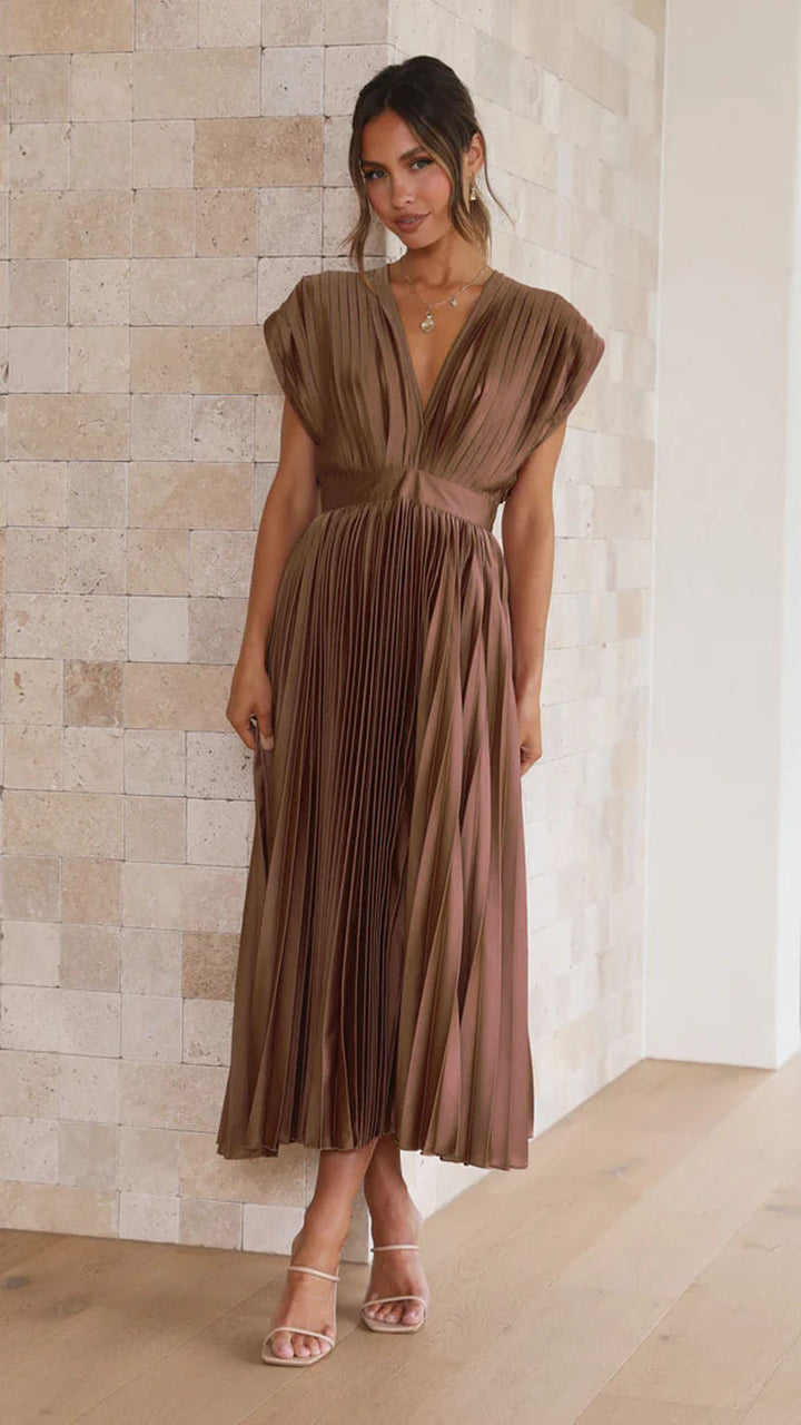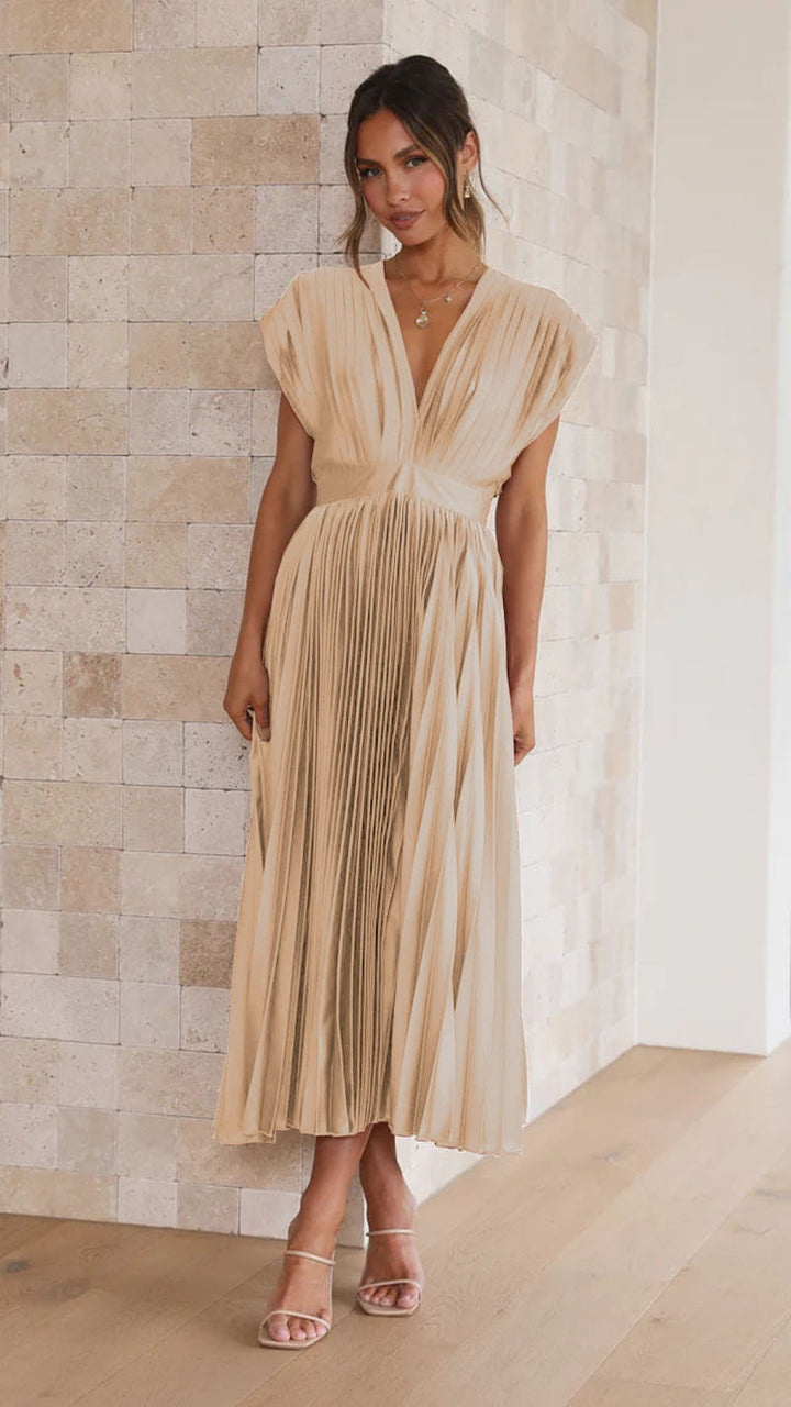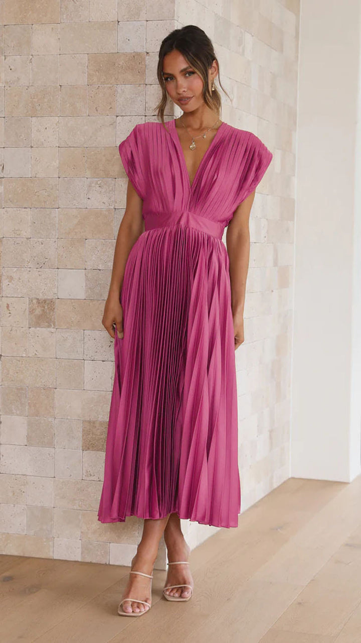 Introducing the Elegant Pleated V-Neck Midi Dress, crafted from high-quality polyester with a graceful silhouette and luxurious feel. This dress features a deep V-neckline and precision pleats that fall perfectly to midi length, making it ideal for formal occasions, weddings, evening events, or stylish dinners. Available in a wide range of colors and sizes (S, M, L, XL), it offers a flattering fit for every body shape.