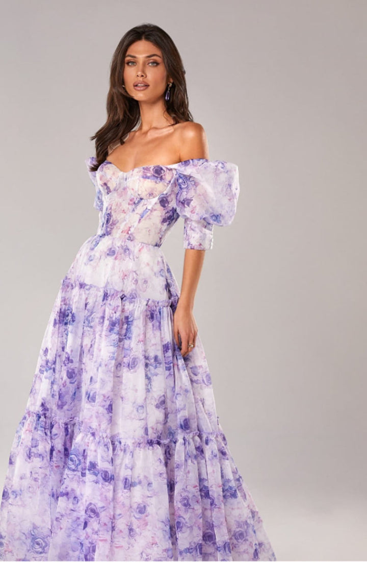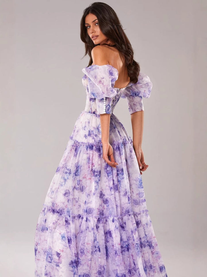Step into elegance with the Fairy Bloom Puff Sleeve Maxi Dress, crafted from lightweight polyester for a dreamy, romantic feel. This flowing maxi dress features delicate floral prints in soft blue, pink, and purple tones—perfect for weddings, garden parties, or romantic dinners. The off-shoulder puff sleeves and fitted bodice accentuate your silhouette while the flared skirt offers graceful movement.