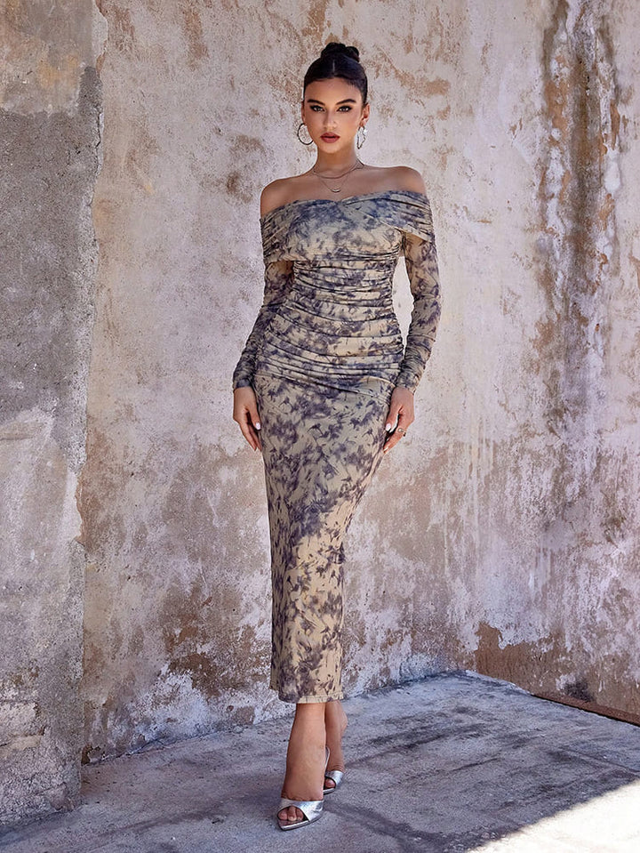 The Off Shoulder Tie-Dye Print Bodycon Midi Dress is the perfect blend of elegance and modern chic. Featuring an off shoulder neckline, ruched detailing, and a body-hugging silhouette, this dress is designed to accentuate your curves while offering comfort and style. Its tie-dye effect adds a unique artistic touch, making it a standout choice for evening events, cocktail parties, or special occasions.